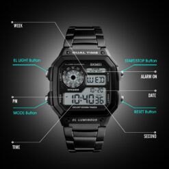 This is a 5ATM water-resistant digital sports watch for men. It has Multi-function such as dual time, countdown, alarm, week, date, chronograph, 12/24 hours.